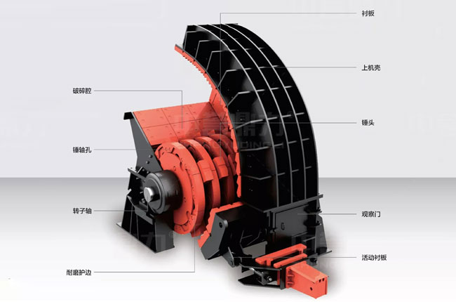 上圖就是重錘式破碎機(jī)的結(jié)構(gòu)名稱了,主要由破碎腔、錘頭、襯板、護(hù)邊、錘軸孔、上機(jī)殼、觀察門、轉(zhuǎn)子軸、活動(dòng)襯板等組成。