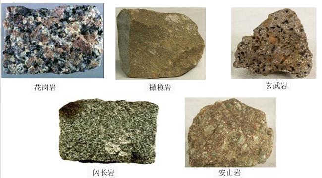 常見巖漿巖有:花崗巖、花崗斑石、流紋巖、正長石、閃長石、安山石、輝長巖和玄武巖等(強度約為250兆帕)。