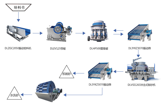 河卵石硬度較高,破碎環(huán)節(jié)可以選用鄂破+圓錐破兩段破碎工藝,制砂環(huán)節(jié)可用2臺沖擊式制砂機(jī),工藝流程為:河卵石原料經(jīng)振動(dòng)給料機(jī)均勻輸送給顎式破碎機(jī)進(jìn)行粗碎,粗碎后的物料直接輸送到圓錐破進(jìn)行中碎,中碎后的物料再被輸送到2臺沖擊式制砂機(jī)進(jìn)行制砂。