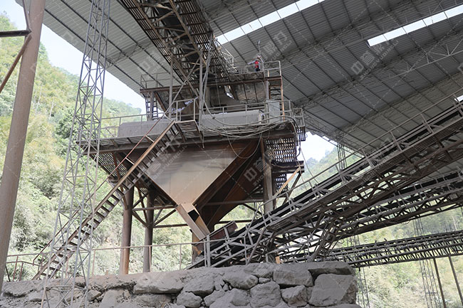 中轉料倉通過儲存粗碎后的原料可均衡骨料加工線整體的系統(tǒng)能力,粗破工段檢修時,下游的骨料加工工段不會因此停產(chǎn),可減少停工損失,中轉料倉頂部設置防雨棚,底部預留排水孔,可進入二級破碎階段原料的含水率,是采用干法加工時,能有限成品含粉量,減少石粉粘結堵塞篩網(wǎng)、溜槽、溜管。中轉料倉盡量借助地勢,提高儲量。