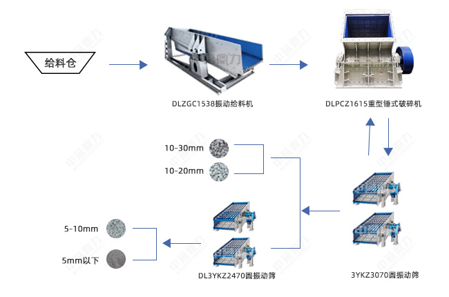 破碎環(huán)節(jié)只用一臺DLPCZ1615重型錘式破碎機,既用來做粗碎,也用來加工頭道篩的返料,取代傳統(tǒng)兩段破碎,較大程度上減少設(shè)備投資成本,頭道篩出10-30mm、10-20mm兩種成品料,二道篩出5-10mm、5mm以下石粉兩種成品料。