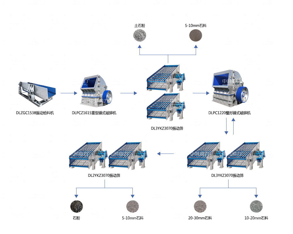 利用重錘破一次成型的性能優勢,頭破直接出一部分5-10mm成品料,并經過頭道篩篩分混料中的土石粉,提高成品料潔凈度,剩余物料經過二次破碎后,先后進入兩道篩分,分別出20-30mm、10-20mm和5-10mm、石粉等成品料。