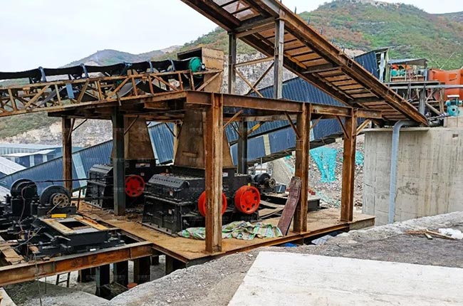 方案三:振動給料機+重錘式破碎機+錘式細碎機2臺+雙轉子制砂機4臺+振動篩+輸送機;