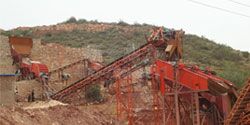 大塊的原料經由原料倉進入振動給料機,使物料以均勻的速度到達破碎腔內部進行破碎,破碎后的物料經過圓振動篩進行篩分,滿足粒度的物料被輸送至成品料堆,不滿足粒度的物料經皮帶輸送機運輸?shù)蕉壠扑闄C進行再次破碎,達到規(guī)格粒度物料被運往成品料堆。