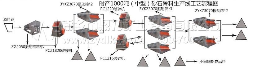 石料生產線在工作過程中,大塊石料經料倉由振動給料機均勻地送進重型錘式破碎機進行粗碎,粗碎后的石料由皮帶輸送機送入錘式破碎機(或反擊式破碎機)進行中碎,中碎后的石料由膠帶輸送機送進振動篩進行篩分,符合規格的石料和成品砂子(篩下物)由膠帶輸送機送至成品料堆;不符合規格的大顆粒石料(篩上物)由皮帶輸送機返回至錘式破碎機再次進行破碎處理,破碎后的石料再經過膠帶輸送機送進振動篩進行篩分,這樣形成閉路多次循環。