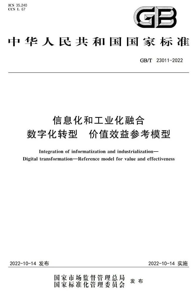 2022年10月,國家市場監(jiān)督管理總局(國家標準化管理委員會)發(fā)布2022年第13號中國國家標準公告,批準《信息化和工業(yè)化融合 數(shù)字化轉(zhuǎn)型 價值效益參考模型》(GB/T 23011-2022)正式發(fā)布。