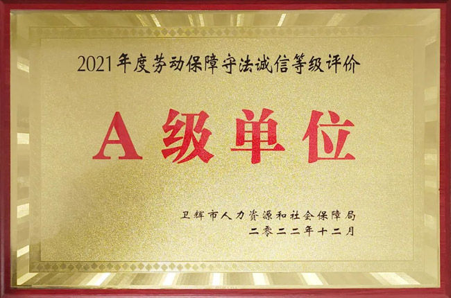 獲評“2021年度勞動保障守法誠信A級用人單位”