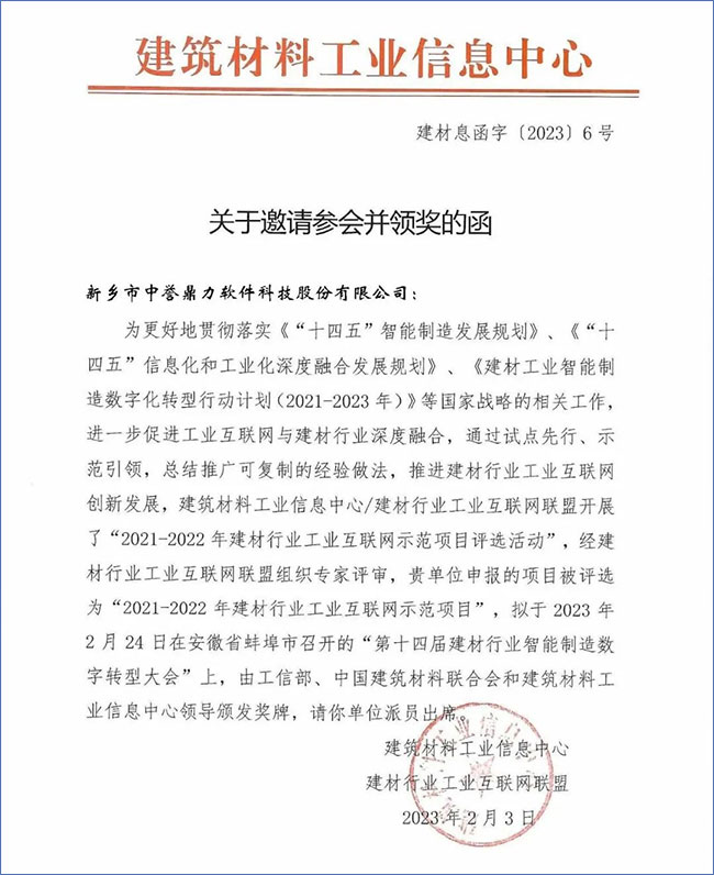 新鄉市中譽鼎力軟件科技股份有限公司“砂石骨料行業工業互聯網平臺”項目被評為“2021-2022年建材行業工業互聯網項目”。