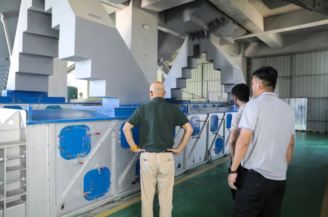在項目輸送車間,考察團成員著重了解了中譽鼎力創(chuàng)新產(chǎn)品箱式皮帶輸送機及其優(yōu)勢,點贊該設備環(huán)保、省錢省力。