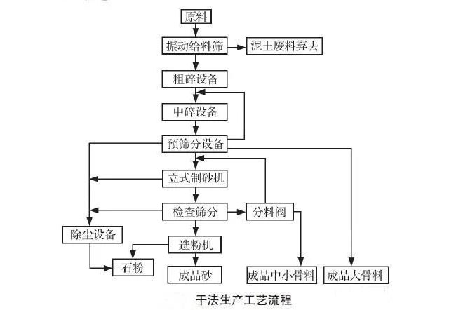 中北方干旱、少雨,水資源缺乏,在這種自然條件下,優(yōu)先采用干法工藝生產(chǎn)砂石骨料。干式制砂法自開始推廣普及以來,通過設(shè)計院、設(shè)備廠家和用戶各方技術(shù)人員的不斷努力,困擾干法生產(chǎn)的泥土、風(fēng)化巖、石粉含量過高以及生產(chǎn)時粉塵污染問題已經(jīng)初步得到了解決,已經(jīng)成為目前大型骨料生產(chǎn)線選生產(chǎn)工藝。目前有塔樓式干法制砂生產(chǎn)線和平面式制砂生產(chǎn)線兩種。