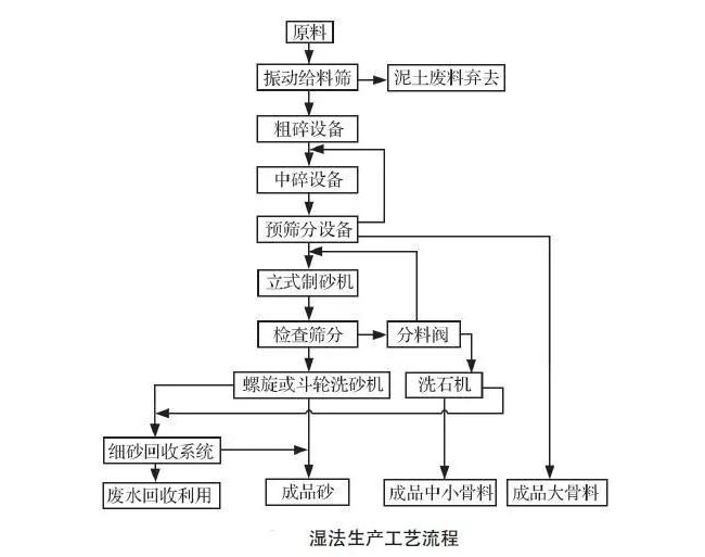 生產(chǎn)過程中水作為工作介質(zhì)和抑塵措施,程參與砂石骨料的生產(chǎn),故稱為濕法工藝。濕式制砂法一般在水資源較豐富的地區(qū)采用,在我南方水電站配套砂石骨料廠,如長江三峽水電站,白鶴灘水電站等大型、特大型項目配建的砂石骨料線,均采用濕法工藝。