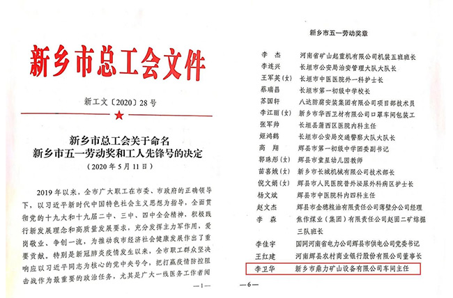 為鼓勵,樹立典型,進一步增強新時代工人階級的自豪感和使命感,大力弘揚勞模精和工匠精,營造勞動光榮的社會風尚和精益求精的敬業風氣,日前,新鄉市總工會對2019年為市經濟社會健康發展作出重要貢獻的個人和集體進行了表彰。其中,243人榮獲“新鄉市五一勞動獎章”,新鄉市鼎力礦山設備有限公司車間主任李衛華獲此殊榮!