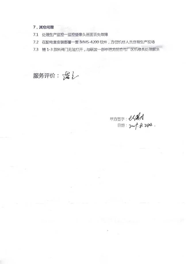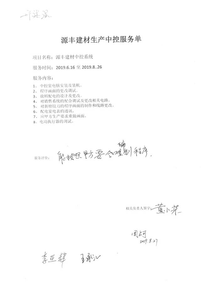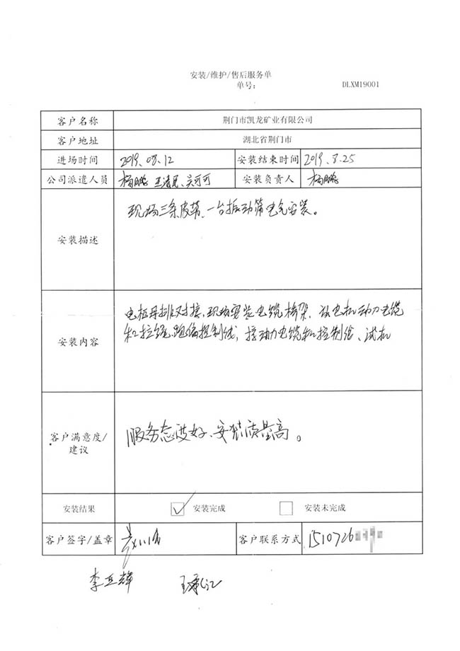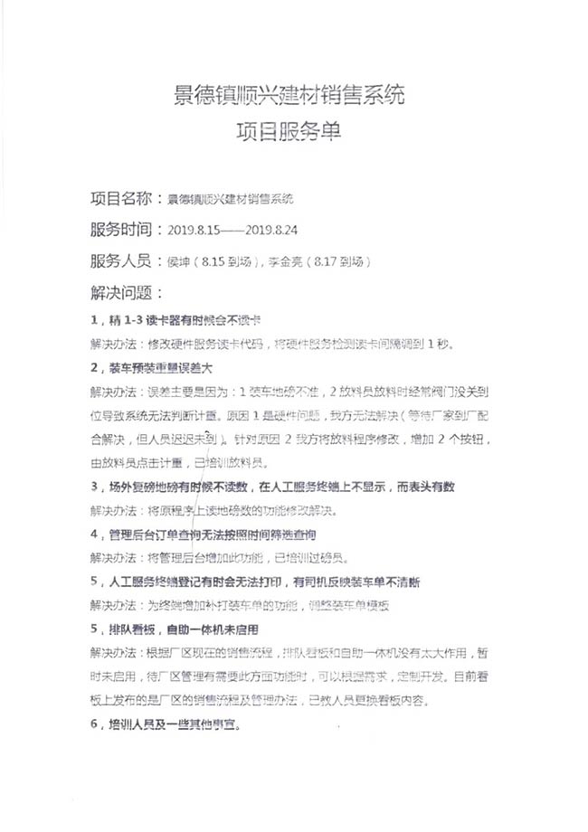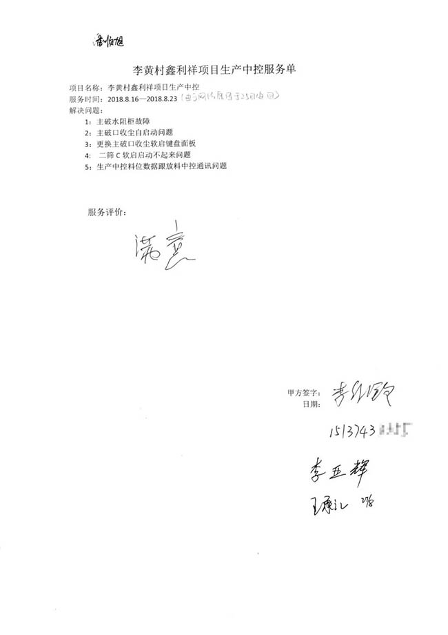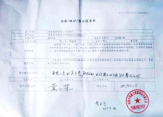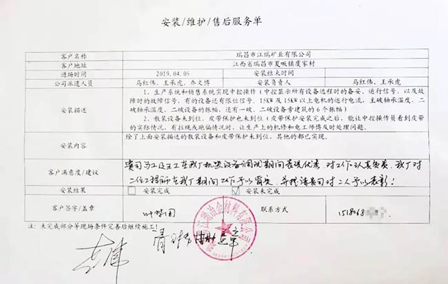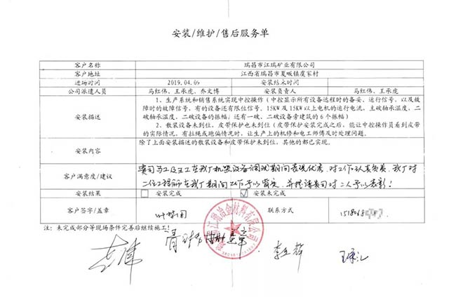與客戶打交道的過程,不僅有電氣成套設(shè)備、低壓配電柜、礦山骨料生產(chǎn)線的管理軟件的安裝調(diào)試,還有監(jiān)控設(shè)備工程、電氣工程的施工等等。咨詢,設(shè)計(jì),施工,調(diào)試,維護(hù),培訓(xùn)……如何做到每一個(gè)環(huán)節(jié)都精益求精,達(dá)到客戶要求?完善的質(zhì)量管控和服務(wù)體系不可少。而“項(xiàng)目服務(wù)單”就是其中一項(xiàng)重要措施,記載并參與了服務(wù)的過程。