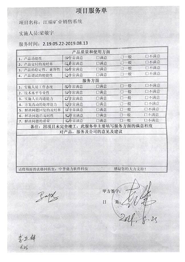 在中譽(yù)鼎力軟件科技股份有限公司,有一張“項(xiàng)目服務(wù)單”。這薄薄的一頁紙,記載了中譽(yù)鼎力員工去客戶現(xiàn)場進(jìn)行智能礦山管理系統(tǒng)安裝、維護(hù)、售后、問題解決等各項(xiàng)細(xì)節(jié);也是中譽(yù)鼎力員工精細(xì)的施工品質(zhì)、完善規(guī)范的管控機(jī)制,以及追求客戶滿意的服務(wù)理念的真實(shí)寫照。
