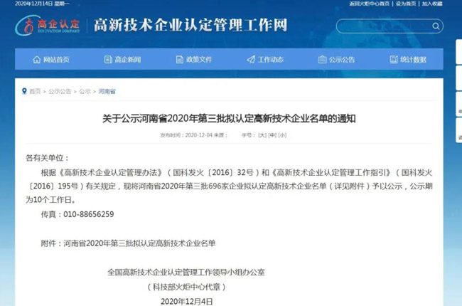 根據家《高新技術企業認定管理辦法》(科發火〔2016〕32號)和《高新技術企業認定管理工作指引》(科發火〔2016〕195號)有關規定,12月4日,高新技術企業認定管理工作導小組辦公室在官網上對河南省2020年第三批擬認定高新技術企業名單進行了公示。