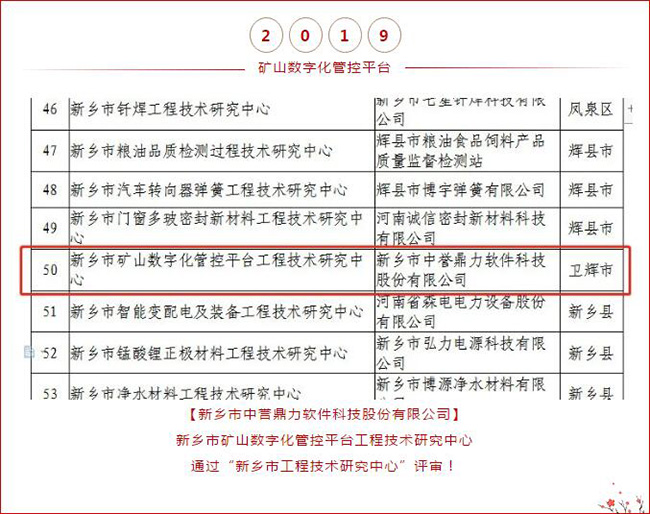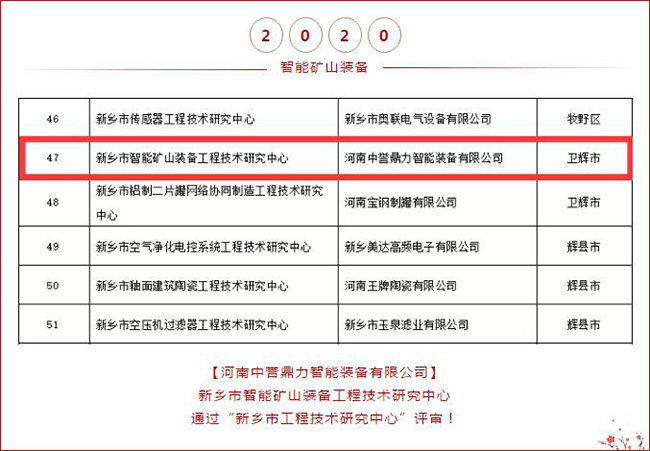 根據《新鄉市市級工程技術研究中心管理暫行辦法》(新科計〔2016〕33號)的有關規定,市科技局組織對申報的新鄉市工程技術研究中心開展了會議評審和現場審核。日前,經局長辦公會研究決定,及為期7天的公示,認定86家工程技術研究中心為2020年度新鄉市工程技術研究中心。河南中譽鼎力智能裝備有限公司建設的“新鄉市智能礦山裝備工程技術研究中心”入選!這也是中譽鼎力次進入新鄉市工程技術研究中心名單!