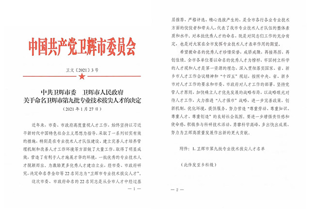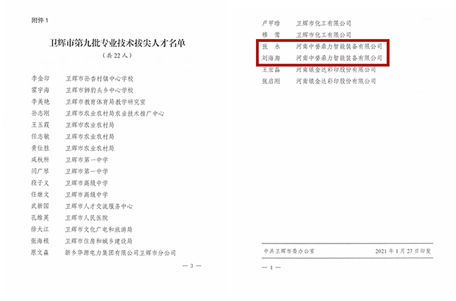 2021年1月27日,衛輝市委、市發布《關于命名衛輝市第九批技術拔尖人才的決定》。中譽鼎力董事長張永、河南中譽鼎力智能裝備有限公司技術中心部長劉海淘被任命為“衛輝市技術拔尖人才”!