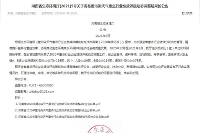 近日,河南省生態環境廳公布了《關于發布重污染天氣重點行業績效評級動態調整結果的公告》([2021]5號),河南中譽鼎力智能裝備有限公司成功入選2020年重污染天氣重點行業績效評級動態調整B級企業名單,并順利通過公示!
