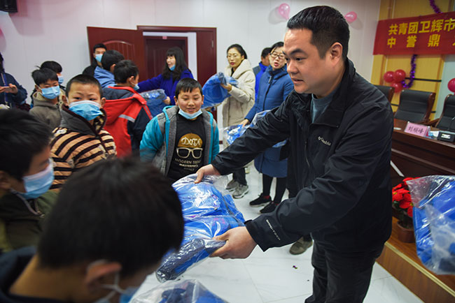 河南中譽鼎力智能裝備有限公司常務副總張志宇為學生分發棉衣