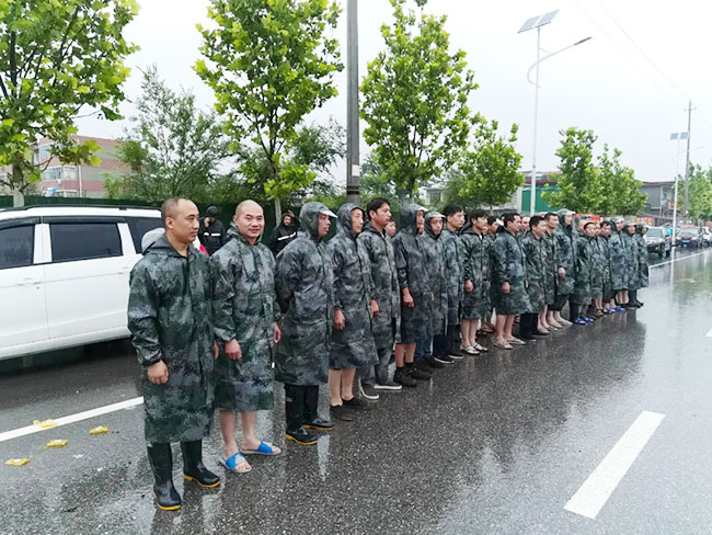 21日晚上十點半,得知衛(wèi)輝山上要泄洪,公司員工群里緊急通知所有在廠男職工迅速集合,你搬沙袋我推土,趕緊堵住車間大門,生產(chǎn)設(shè)備不受損壞。大家齊上陣,共努力,爭分奪秒為打贏這場抗洪戰(zhàn)爭而努力。