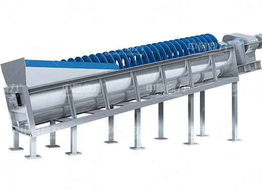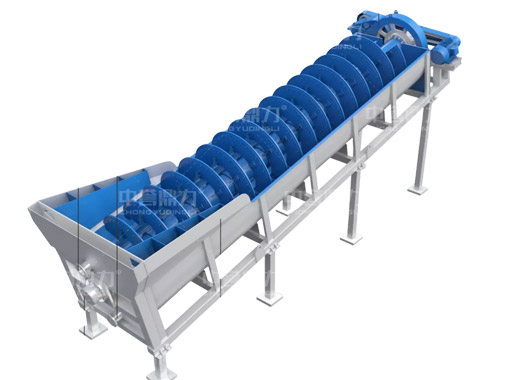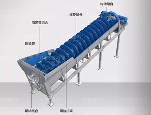 螺旋式洗砂機由傳動部分、螺旋、洗槽、清淤管、溢流管、尾軸、機殼等部分組成;傳動裝置:由電動機、皮帶輪、減速器等組成,用來驅動螺旋旋轉,轉速大小可調整;螺旋部分:空心軸、支架、螺旋葉片等組成,螺旋葉片由耐磨鑄鐵制成,更換方便;水洗槽:加厚鋼板焊接而成,底部配合螺旋片呈半圓形;