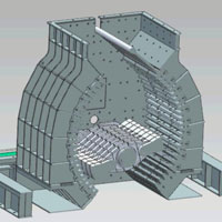 機殼采用雙腔對稱設計,可一次性容納更多物料,提高破碎產量,工作時,電機帶動錘頭高速運轉,對從上方落入的物料形成沖擊力,此時的物料獲得動能后高速撞向機腔內壁的反擊板,造成物料的次破碎,從物料進入機腔便相互碰撞形成自粉碎,物料在多次撞擊、研磨作用下達到所需粒度,從機腔側下方出料口排出,完成破碎過程。