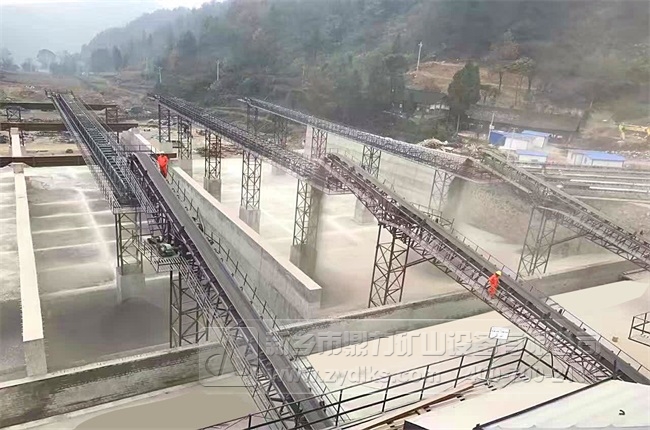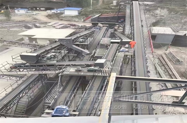 上圖為貴州遵義同興源建材時產1000噸骨料生產線生產現場,排列整齊的皮帶輸送帶有序的運送骨料,在一些皮帶輸送機密集的區域,設置了脈沖袋式除塵器,也是由中譽鼎力研發的,將設備安裝在基臺上方,占地面積小,節省基建投資。
