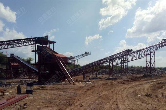 石料由ZGC1038振動給料機均勻地送到頭破(PCZ1510重型錘式反擊破碎機)進行粗破,粗破后的物料由膠帶輸送機送入到二破(XPC0808錘式破碎機)進行細碎,細碎后的物料被輸送到一組并篩2YKQ2060振動篩進行篩分,篩分出1-3、1-2、0-5和石粉四中成品料,由輸送帶送到成品料堆。成品粒度可按用戶的需求進行組合和分級。