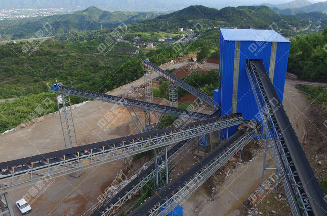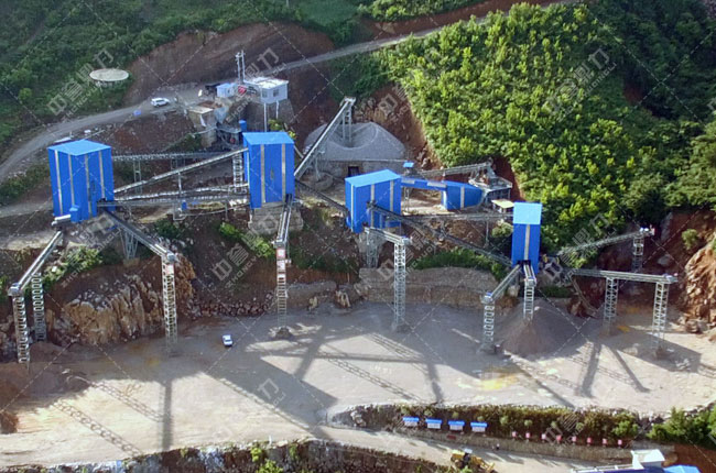 原料經給料機均勻的送到PCZ1615重型錘式反擊破碎機進行粗碎,粗碎后的物料被輸送到送到一組2YKZ2470振動篩并篩進行篩分,篩分出1-3成品料,小于1-3的料被輸送到下一組2YKZ2470振動篩并篩進行再次篩分成1-2、0-5和石粉三種成品料,篩分出來的0-5被輸送到下一臺3YKZ3070進行篩分,篩分出0-5和石粉兩種料,大于1-3的料被輸送到一臺ZSJ1416雙轉子整形破碎機進行整形,經過再次加工的物料被輸送到一臺3YKZ3070振動篩進行篩分,后篩分出1-2和1-3兩種成品料。
