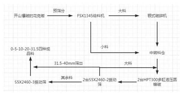 主機設備:HST液壓圓錐破碎機、HPT液壓圓錐破碎機、振動給料機、YZS振動篩