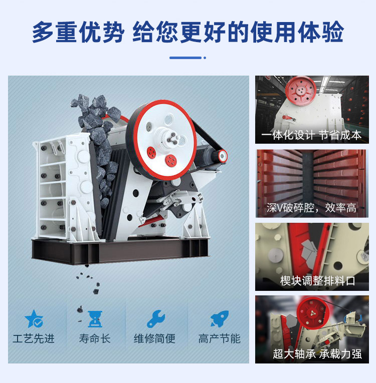 CGE-400顎式破碎機進料口尺寸910×1230mm,可以處理750mm左右的石料,排料口調整閥內100-250mm,一般來說排料口調節越大設備處理量越大,一般用于石料生產線中頭破位置,做石料粗碎加工,時產280-570噸,配置160kw電機,外形尺寸為3265×2925×3845mm。