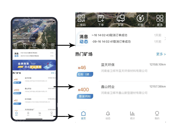 礦山易購APP有多個(gè)模塊,在“統(tǒng)計(jì)”模塊中可看到每天拉料信息、車輛信息、料場信息以及支出金額,并顯示每月的消費(fèi)趨勢,為成本核算提供有力的數(shù)據(jù)支撐。“我的”模塊可以直接為賬戶充值、查詢訂單信息,如待拉料訂單、待結(jié)算訂單、已完成訂單等,消費(fèi)信息一目了然。