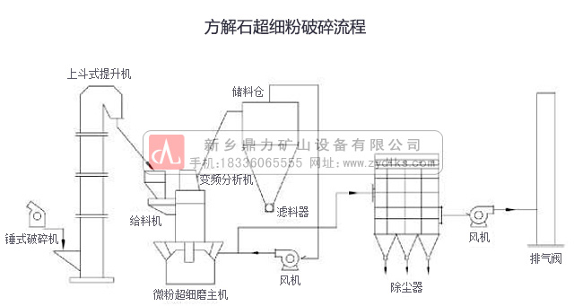 根據客戶對于方解石的產品質量要求,配置對應的生產線,如果是單單需要比較大顆粒的方解石成品料的話,只需要經過我們公司破碎機設備的簡單破碎過程,就可以將成品料輸送出來,但是對于要求比較細的話,只配置上破碎機設備,不能達到終的要求,對于細度需要達到多少目的話,須配置上的磨粉機設備,一般來說生產的大致流程是這樣的,先經過錘式破碎機的破碎流程,然后使用上斗式提升機將成品料提升到儲料倉內,然后經過振動給料機的輸送,輸送到細磨設備內,便完成了生產的過程,要的時候,需要配置上旋風集粉器和脈沖除塵設備,大致的生產過程如下圖: